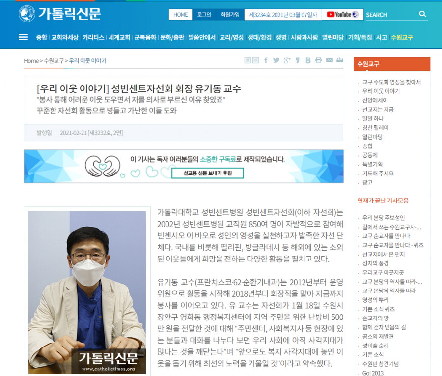 성빈센트자선회 회장인 유기동 교수(순환기 내과)에 대한 기사입니다.