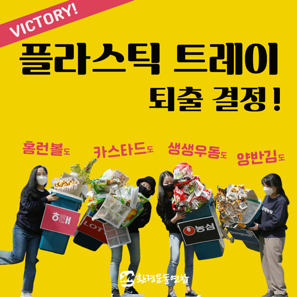 환경운동연합에서 플라스틱 트레이를 다량으로 사용하는 대표적인 제품인 롯데 홈런볼, 해태 카스타드, 농심 생생우동, 동원 양반김 등을 대상으로 트레이를 뺀 채 낙하실험과 택배운송실험을 한 결과를 제시하며 플라스틱 트레이를 제거하는 포장을 해달라고 요구해왔는데요.