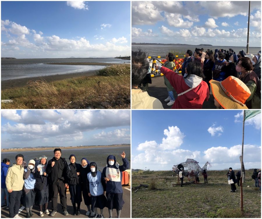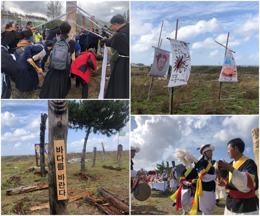 이런 대책 없는 사업으로부터 조금이나마 생태계를 살려내고, 주민들을 살려내자는 지향으로 해창갯벌, 일명 장승갯벌에 두 개의 장승을 세운 후 미사를 봉헌하고, 수라갯벌이 보이는 곳으로 이동하여 그곳에 기대어 살아가는 생물종들에 대한 활동가들의 설명을 들으며 갯벌 보존의 중요성에 대한 체감을 더하는 시간을 가졌습니다.