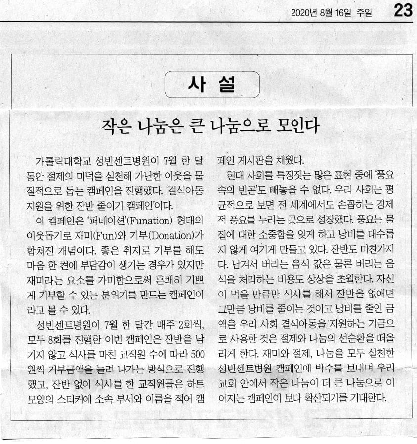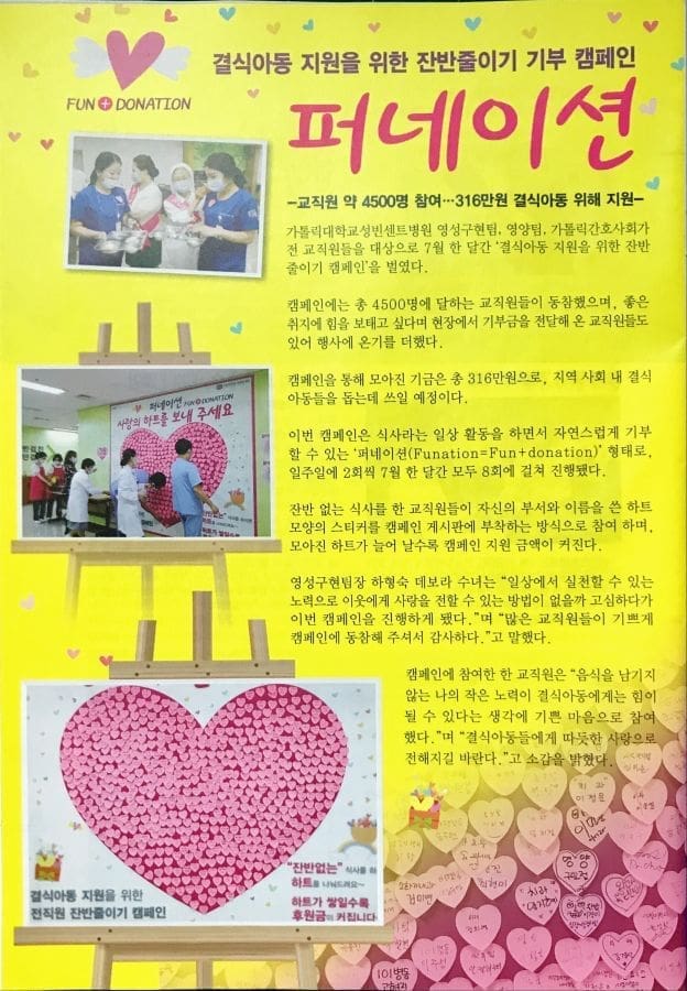 성빈센트병원 교직원식당에서 7월 한 달간 이루어졌던 '퍼네이션(재미+기부)'에 대한 가톨릭신문의 기사입니다.