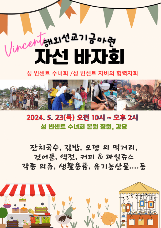 일시 : 2024년 5월 23일 오전10시 ~오후2시까지 / 장소 :수원 성 빈센트 드뽈 자비의수녀회 (야외 바자회)