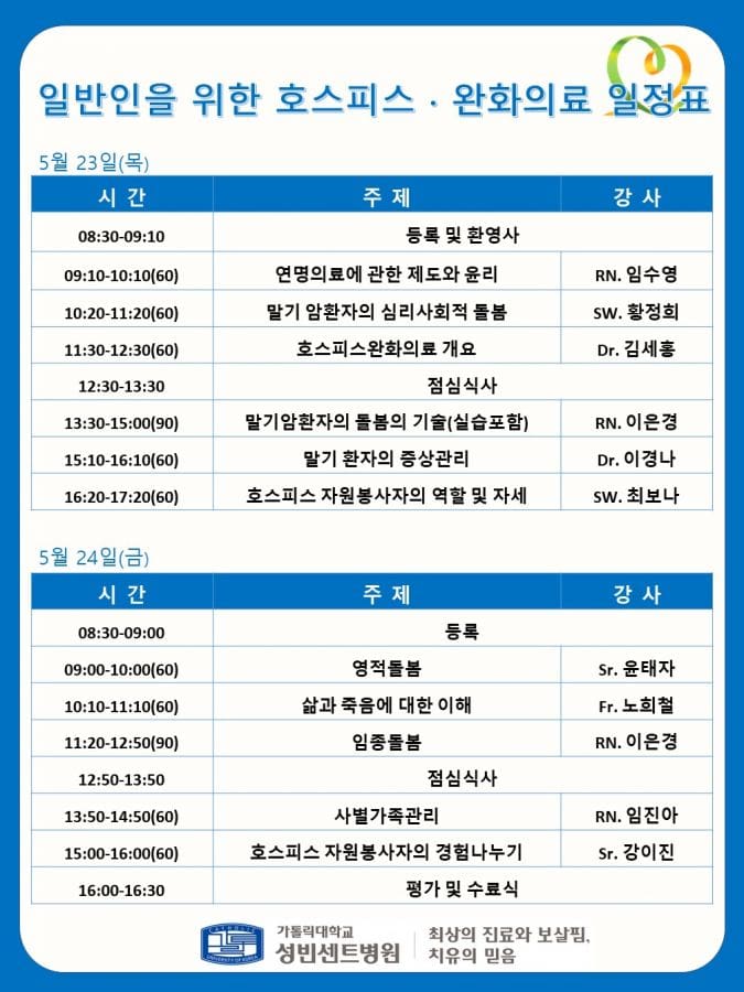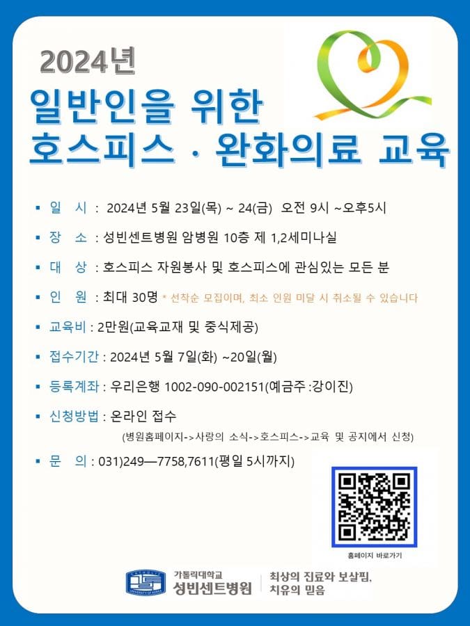 소식 글보기성빈센트병원_일반인을 위한 호스피스 교육 공지 관리자조회수 374 2024-05-13 19:52가톨릭대학교 성빈센트병원 호스피스 완화의료센터에서 일반인을 위한 호스피스 교육을 진행합니다. 본 교육을 받으시면 호스피스 봉사자로서 활동을 하실 수 있습니다. 또한 우리병원 호스피스 병동에서 봉사를 원하시는 분이 있으시면 함께 신청하여 주시기 바랍니다. 고맙습니다. 호스피스완화의료센터 강페트라수녀 카테고리알림 목록답변 댓글 [1] 더보기이전"성빈센트 자비의 협력자회" 1박2일 피정성빈센트영성센터2024-05-17다음자선사도직후원회 소식-5월자선사도직후원회2024-05-02 Powered by MangBoard | 워드프레스 쇼핑몰 망보드