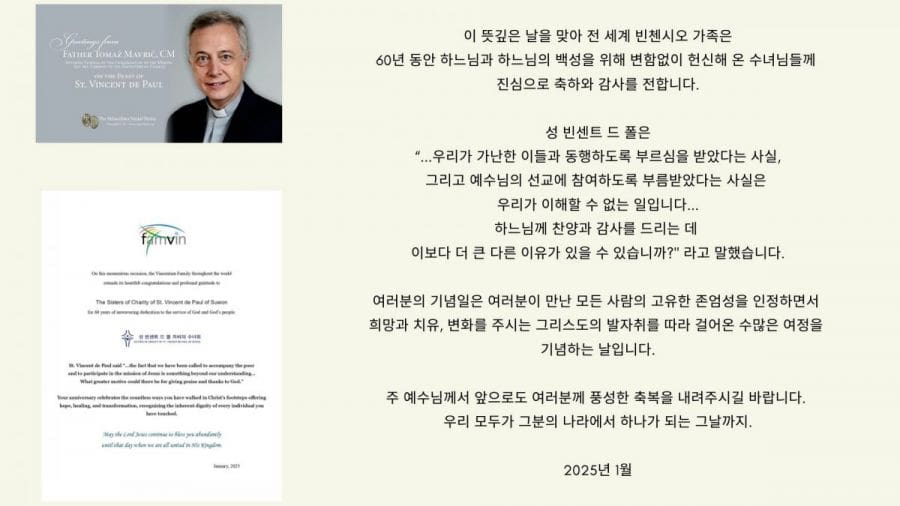 교회의 대희년에 맞이하는 수도회 60주년을 더욱 의미있게 보낼 수 있기를 바라며 기도와 헌신으로 동행해주신 모든 분들께 빈센트 성인의 전구와 주님의 축복을 빕니다.