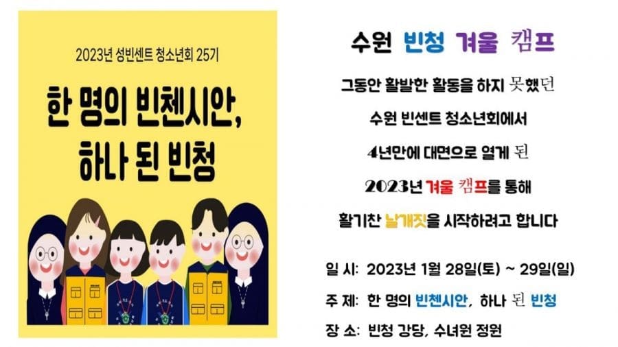 소식 글보기수원 빈청 겨울 캠프 관리자조회수 150 2023-01-25 09:51 수원 성빈센트 청소년회에서는 코로나 기간 온라인으로 피정과 캠프를 진행해왔는데요. 이번에 오랜만에 대면 캠프를 하게 되었습니다. 아이들이 캠프를 통해 더욱 가까워지고 하나될 수 있도록 많은 관심과 기도 부탁드립니다. 카테고리알림 목록답변 댓글 [0] 더보기이전세뱃돈 모아 이웃 돕기_동백성요셉성당 복사단관리자2023-01-27다음2023년 1월 수원역 노숙인 식사나눔성빈센트영성센터2023-01-20 Powered by MangBoard | 워드프레스 쇼핑몰 망보드