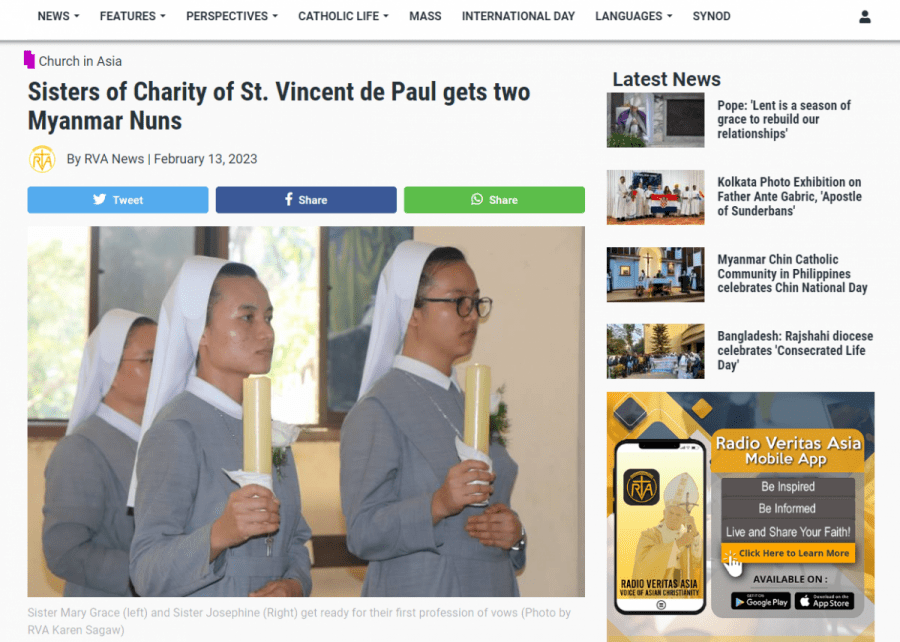 아시아 교회의 소식을 전하는 라디오 베리따스 아시아 웹페이지에 지난 2월 6일 미얀마에서 있었던 첫서원 소식이 실렸습니다. 첫서원 미사는 라디오 베리따스 방송국에서 촬영하며 실시간 중계를 하였는데, 13일에 아시아지역 신문에 기사가 실렸네요. 다른 수도회에서도 많은 신부님, 수녀님들이 참석하셨고 꽃꽂이나 성가대를 다른 수도회에서 도맡아 봉사해주시는 등 우리 수녀님들의 첫서원이 미얀마 교회의 잔치가 된 것 같아 미얀마 공동체 수녀님들에게도 큰 힘이 될 것이라 생각합니다.