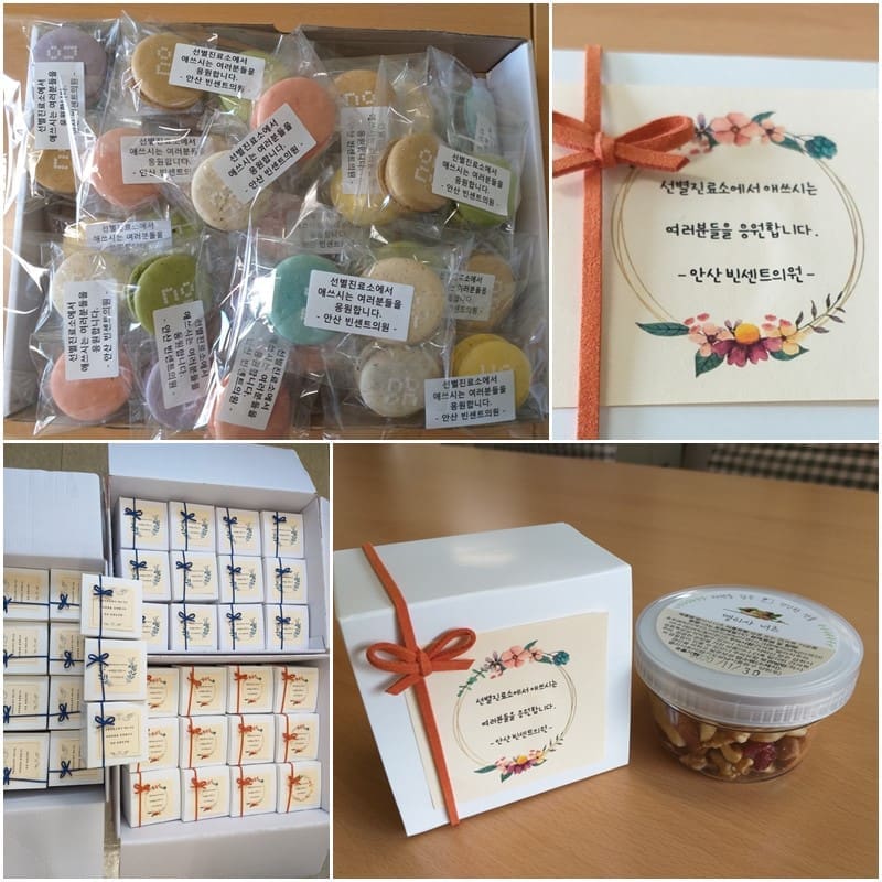 빈센트 병원 선별진료소에서 근무하시는 분들께 마카롱과 견과류 선물을 예쁘게 포장하여 보내주셨습니다.