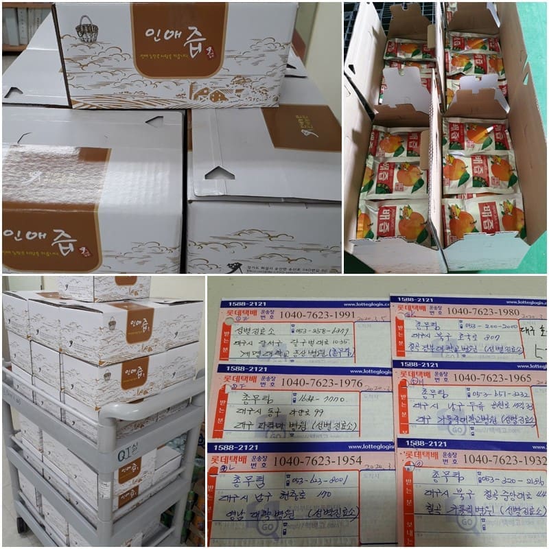 우리 병원 직원들을 위해서도 십여 박스에 해당하는 배즙을 35개 소포장하여 부서별로 보내주셨고요.