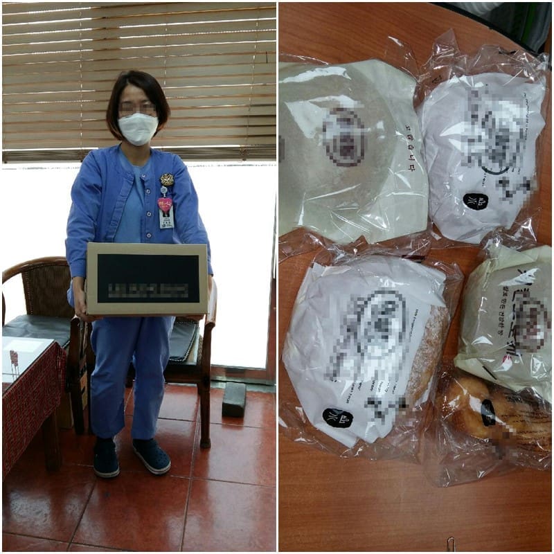 수지 유명 제과점에서 지원받고 있는 빵을 병원 부서 여러 곳에 나누고 계신다고 합니다.