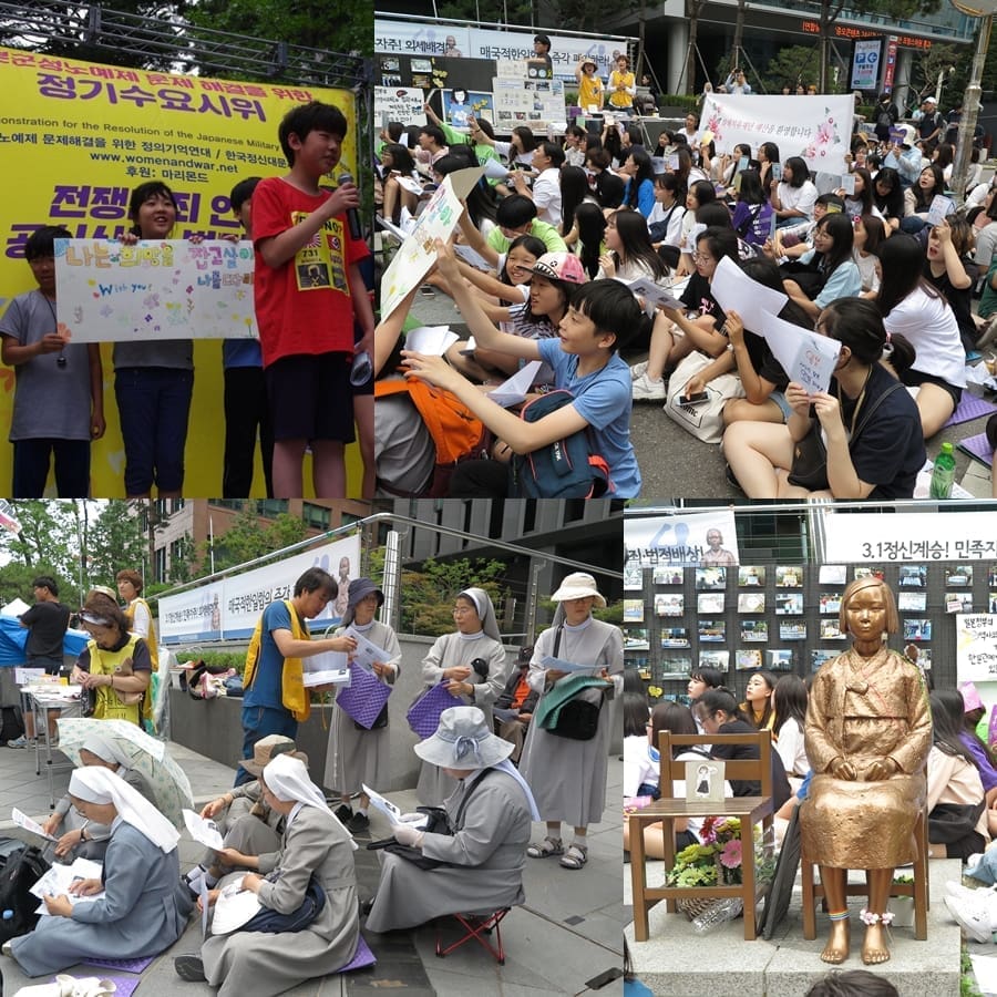 소식 글보기2019.07.10._일본군성노예제 문제해결을 위한 수요시위에 다녀왔습니다. 관리자조회수 418 2019-07-11 11:33 매 수요일 일본대사관 앞에서는 28년 동안 피해자 할머님들의 목소리를 이어 받아, "범죄 인정하라, 공식 사죄하라, 법적 배상하라, 역사교과서에 기록해서 교육하라, 추모비와 사료관을 건립하라, 책임자를 처벌하라"라고 외침이 울려 퍼지고 있습니다.우리 수도회도 오늘 1395차 수요시위에 함께 하였습니다. 94세의 이옥선할머님께는 '내가 15살에 영문도 모르고 끌려갔다, 우리 할머니들이 다 죽어도 이 문제는 해명되어야 한다, 후세대들이 있기 때문이다, 끝까지 같이해서 사죄받게 해달라' 말씀하셨습니다. 현재 21명의 할머님들이 생존해 계십니다. 1395차 수요시위에는 대학생들과 동아리 학생들, 초등학생, 중학생, 고등학생, 시민 등 400명이 함께 했고 아씨시의 프란치스코 수녀회와 우리 수녀회가 참여 하였습니다. 2015한일합의에 의해 만들어진 화해치유재단에 관한 내용은 파일을 참조하시기 바랍니다. 첨부파일화해치유재단 해산에 대한 정의연 성명.pdf (212.1KB)화해치유재단 해산에 대한 정의연 성명.docx (20.4KB) 목록답변 댓글 [0] 더보기이전2019.07.12._전교회 총장 토마스 마브릭 신부님께서 본원을 방문하셨습니다.관리자2019-07-12다음2019.07.06._안산빈센트의원 개원15주년사진과 동영상입니다.관리자2019-07-08 Powered by MangBoard | 워드프레스 쇼핑몰 망보드