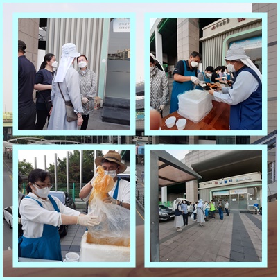 6월 수원역 무료급식은 날씨도 쾌청하여 다른 때보다 많은 분들이 찾아오셨습니다. 100여분을 위해 준비한 음식은 남는 것 없이 모두 나누어 드릴 수 있어 기쁜 날이었구요. 6월 무료급식은 성 빈센트 자비의 협력자회 회원들이 전담해 주셨는데, 협력자회 자매님들이 기증해 주신 구수한 음료수와 떡도 곁들여 드렸습니다. 매월 급식 후원을 해 주시는 이수진 자매님께서도 이달에는 30인분의 음식을 지원해 주셔서 감사한 마음입니다. 수녀원분원과 본원에서 보내주신 후원금도 있어 살림이 풍요로워졌습니다. 준비해 주신 임원들과 현장에서 배식을 담당해 주신 분들, 트럭봉사로 음식을 이동해 주신 라파엘 형제님, 함께 해 주셔서 감사합니다.
