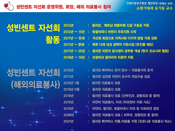 영성구현상은 해마다 가톨릭의 사랑과 봉사의 삶을 실천한 CMC전체 기관의 우수 교직원을 추천 받아   현장실사와 엄격한 심의과정을 거쳐서 받는 영예로운 상입니다.  순환기내과 유기동 교수는 성빈센트병원의 심뇌혈관센터의 시작과 성장에  중추적인 역할을 한 점과 성빈센트자선회 회장으로 국내외 다양한 자선활동 등에 대해  많은 점수를 받았습니다.