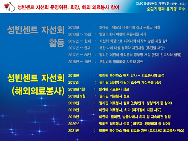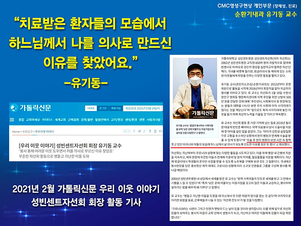"가톨릭중앙의료원 2020 CMC 영성구현상의 개인부문에  성빈센트병원의 유기동 교수가 최고 점수를 받아  개인부문 우수상을 수상하였다."