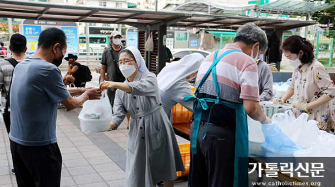 코로나 4단계, 위험한 시간에서 실천한 사랑은 배고픈 이웃에게 생명을 살리는 밥 한 그릇이 되었습니다. 주방에서 담궈주신 맛깔진 석박지, 후원 받은 음료수와 함께  뜨끈한 보양식을 드릴 수 있어서 기뻤습니다.    사랑의 기도, 봉사, 나눔으로 함께 할 수 있었던 시간들에 감사드립니다. 자비의 협력자 회원들이 현장에서 배식 봉사에 함께 하였습니다.