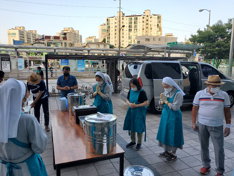 수녀님들의 정성과 사랑을 맛있게 드시고, 더 주세요 하시는 분과 감사하다는 눈 인사를 나눌수 있었습니다. 수녀님들의 기도와 사랑의 정성을 밥 한그릇에 담은 봉사의 나눔터입니다. 협력자회는 수원역 도로옆에서 밥상을 차리고 나눌수 있도록 언제나 가이드역할로 우리를 든든하게 해줍니다.