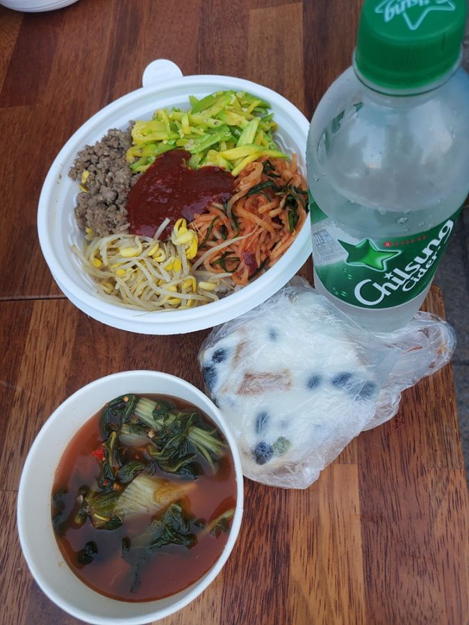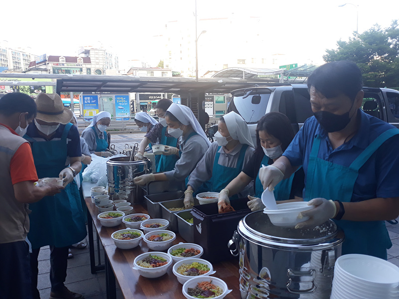 성모님의 전구를 청하며 시작기도를 하는 수녀들과 봉사자들 옆에서 줄을 서서 기다리는 우리들의 주님들에게 여름철의 밥인 보리밥, 콩나물, 애호박, 무 생채, 소고기 고명, 열무물김치, 양념장을 준비해 비빔밥을 나누었습니다.