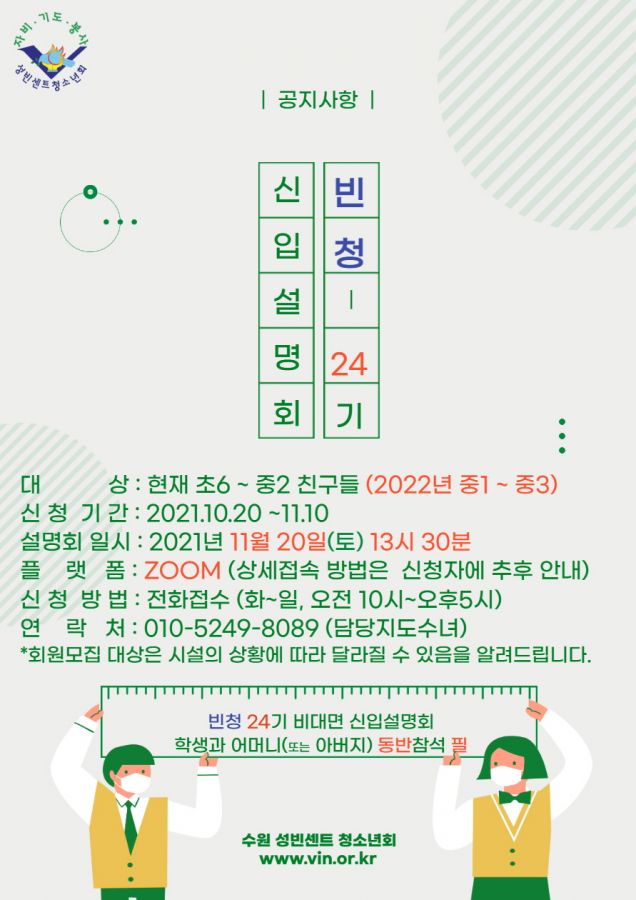 성빈센트 청소년회 제 24기 회원 모집 공지 자비, 기도, 봉사의 정신으로 빈센트 성인의 영성을 통해 자신과 자연과 이웃 안에서 하느님을 만나는 이 곳! 성 빈센트 청소년회에서 아래와 같이 2022년에도 함께할 새로운 친구들을 모집합니다. --- 아 래 --- 대 상 : 현재 초등학교 6학년 ~ 중2 남녀 친구들 (2022년 중1 ~ 중3) 신 청 기 간 : 2021년 10월 20일 ~ 11월 10 설명회 일시: 2021년 11월 20일(토) 오후 1시 30분 플 랫 폼 : ZOOM (상세 접속 방법은 신청자에 추후 안내) 신 청 방법 : 전화접수 (화~일, 오전 10시~ 오후5시) 연 락 처 : 010-5249-8089 (담당 지도수녀) 합격자 발표 : 1차 서류심사 후 홈페이지 공지, 2차 면담 후 최종 합격자 개인연락 드립니다. * 어머니(또는 아버지)와 학생 필히 동반 참석하여주시기 바랍니다. 홈페이지 : www.vin.or.kr