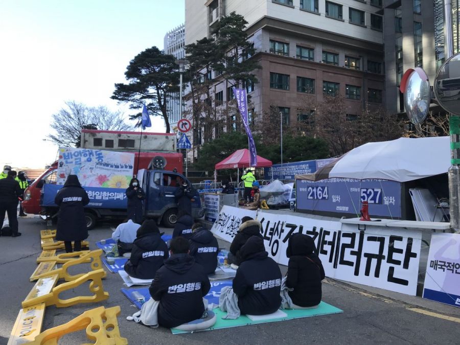 12월 1일, 일본대사관 앞에서 몇 십 미터 떨어진 곳에서 1240회 수요집회가 열렸습니다. 지난 해부터 소녀상 앞 시위 장소 점거를 위해 보수성향 단체 '자유연대'와 진보성향 단체 '반일행동'이 대치하는 가운데 수요집회는 30년 가까이 지켜오던 자리를 내주고 두 단체의 확성기 소리에 묻히지 않기 위해 더 큰 소리로 구호를 외치고, 지지발언을 해야했습니다.