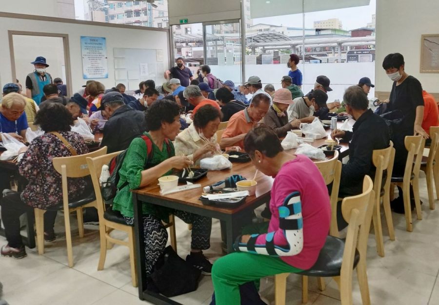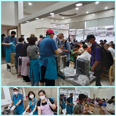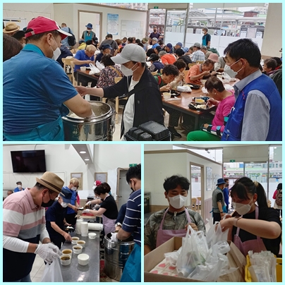 6월 수원역 노숙인 식사나눔은 협력자회에서 주관하였고, 6기 회원들이 배식봉사를 하였다. 특별히 이번에는 수원역 노숙인들이 사용하는 식당인 ‘정 나눔터’가 코로나로 인해 폐쇄되었다가 오랜만에 문을 열었다. 너무 반가운 소식이었다. 늘 역 광장 바닥에서 식사를 해야하는 모습에 안스런 마음이 들었는데, 의자가 있는 식탁에서 저녁 한 끼를 대접할 수 있어서 모두들 뿌듯했다. 거리의 우리 주님들을 만날 때마다 좀 더 나은 환경에서 돌봄의 영성을 실현하면 얼마나 좋을까! 현실의 아쉬움이 언젠가는 이루어지리라 기도하면서 , 6월 예수성심성월에 성심의 사랑 안에서 90명의 우리 주님들과 만남이 행복한 시간이었다.