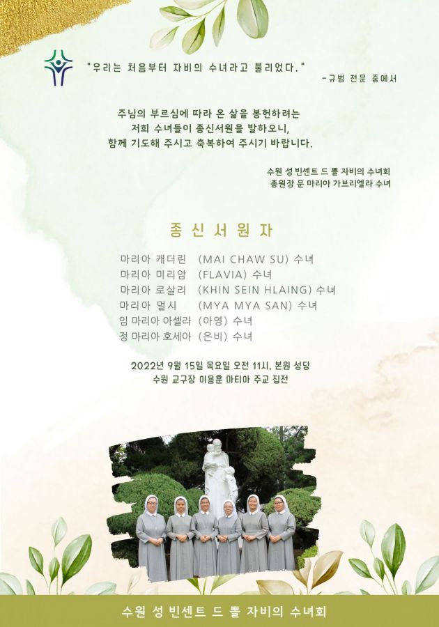지난 6개월간 종신서원 준비기간을 가졌던 여섯 명의 수녀들이 9월 15일 (목) 11시 미사 중에 하느님께 자신을 온전히 봉헌하는 종신서원을 발하게 됩니다.