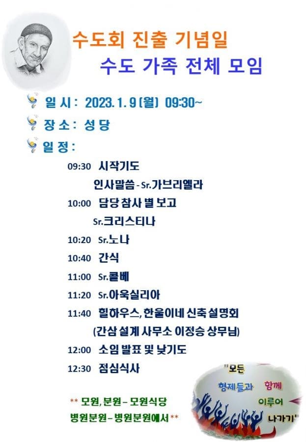 공지사항 제목성 빈센트 드 뽈 자비의 수녀회 한국진출 정기 모임2022-12-23 12:13작성자아욱실리아 수녀+ 평화수녀님들 안녕하세요? 다름이 아니라 저희가 해마다 갖는 1월 8일 모임을 2023년도엔 1월 9일 월요일에 하려고 합니다.수녀님들 모두 참석해 주시기 바라며 일정표를 올립니다.모쪼록 기쁜 성탄절이 되시고 새해에도 작은 아기로 이 세상에 오신 예수님을 마음에 품고 행복한 수도 여정이 되시길 기도합니다. 아욱실리아 수녀 드림 추천(0)목록답변 댓글 [0] 댓글작성자(*)비밀번호(*)자동등록방지(자동등록방지 숫자를 입력해 주세요)내용(*) 댓글 등록 더보기이전수도회 진출 기념일 전체모임 안내아욱실리아 수녀2023-12-25다음협력자회 신입생모집성빈센트영성센터2020-01-02 Powered by MangBoard | 워드프레스 쇼핑몰 망보드