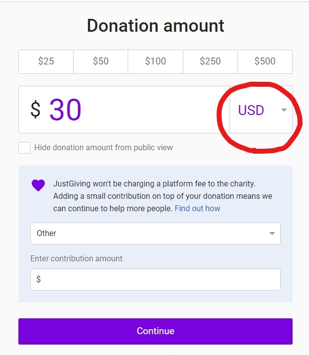 2) 화폐 단위 선택 후 Continue 클릭 (하늘색 사각형은 해당 전자기부시스템을 지원하는 금액입니다. 금액은