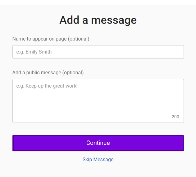 윗칸에 기부자 이름 (개인이나 기관 이름 혹은 안쓰셔도 됩니다) 아래칸에 응원의 메시지 (안쓰셔도 됩니다) Continue 클릭