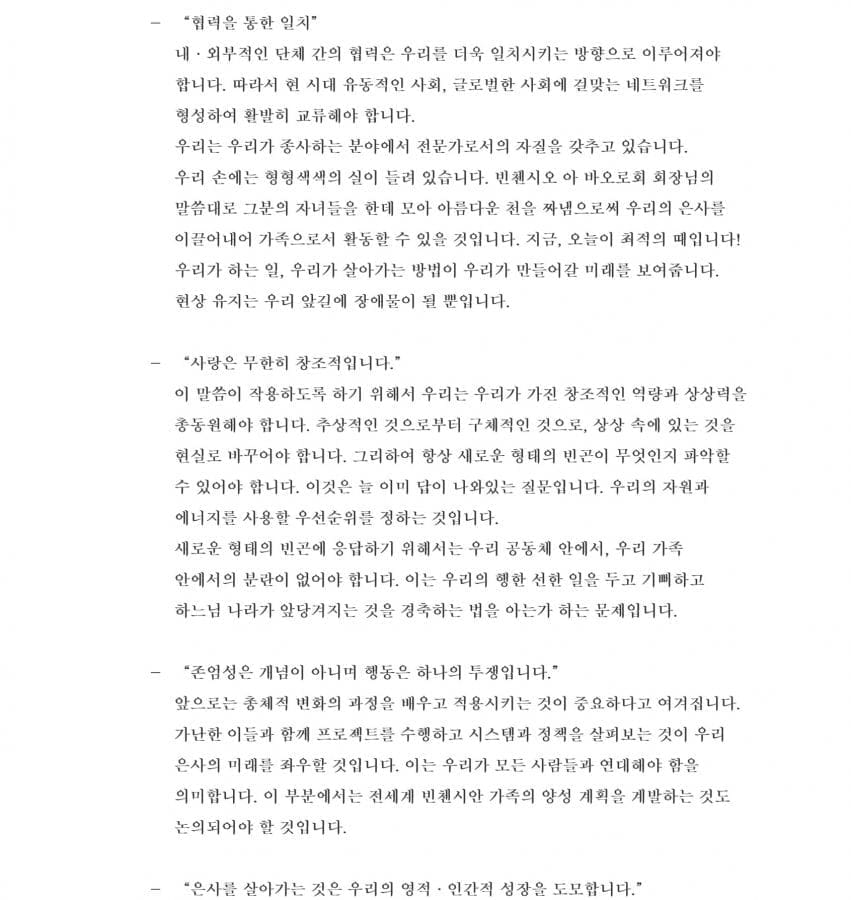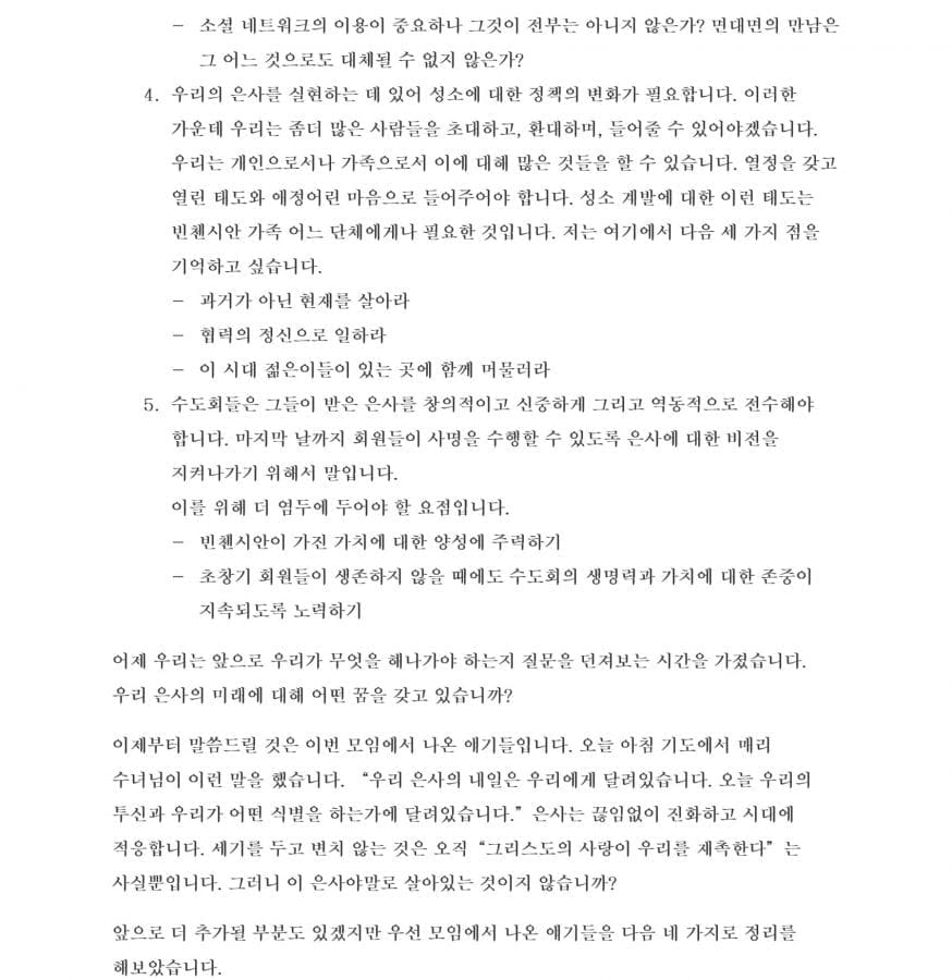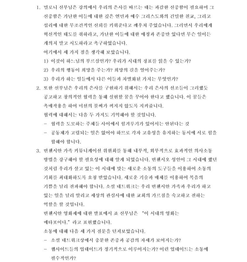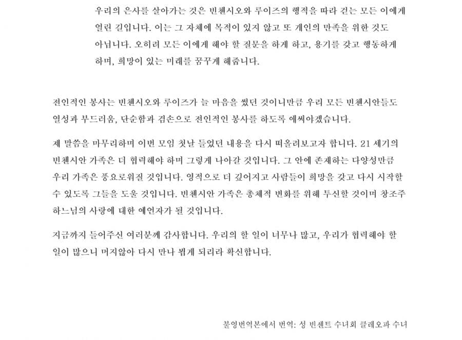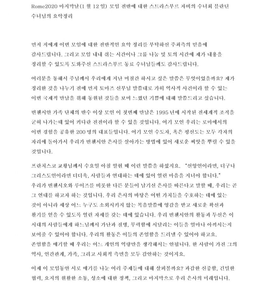 나눔 제목Rome2020 모임 내용 요약 정리_스트라스부르 자비의 수녀회 블란딘 수녀2020-02-07 20:12작성자관리자첨부파일모임내용요약정리_EK_Sr. 블란딘_Rome2020.pdf (1.13MB)모임내용요약정리_EK_Sr. 블란딘_Rome2020.docx (25.2KB) Rome 2020 모임을 마치며 스트라스부르 자비의 수녀회 블란딘 수녀님이 5일간의 모임 내용을 요약 발표하신 내용입니다.첨부된 PDF 파일을 내려받으실 수 있습니다.불영 번역본 링크: https://famvin.org/en/2020/01/26/summary-of-the-meeting-of-the-leaders-of-the-vincentian-family-rome-2020/ 목록답변 댓글 [0] 댓글작성자(*)비밀번호(*)자동등록방지(자동등록방지 숫자를 입력해 주세요)내용(*) 댓글 등록 더보기이전Rome2020 토마즈 마브릭 신부님 말씀_빈첸시안 가족의 현주소와 향후 협력에 대한 논의 관리자2020-02-07다음"기도가 가진 변화의 힘"_ 토마즈 마브릭 신부님의 사순편지관리자2020-02-28 Powered by MangBoard | 망보드 스토어
