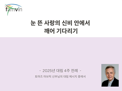 나눔 제목대림 4주 전례2025-12-21 10:31작성자관리자대림 4주 전례는 토마즈 마브릭 신부님의 대림 메시지 발췌글을 바탕으로 한 묵상입니다.<아래 사진을 클릭하시면 영상이 재생됩니다_14분 30초> 목록답변 댓글 [0] 댓글작성자(*)비밀번호(*)자동등록방지(자동등록방지 숫자를 입력해 주세요)내용(*) 댓글 등록 더보기다음빈첸시안 가족에게 보내는 대림 편지_토마즈 마브릭 신부관리자2025-11-29 Powered by MangBoard | 망보드 스토어