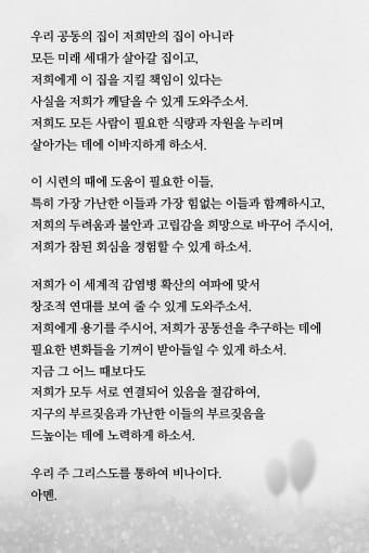 나눔 제목"찬미 받으소서 " 반포 5주년 기념 공동 기도문 (2020. 8.1-2021. 5.24까지)2020-07-28 11:43작성자비서실첨부파일기도문1.jpg (75.9KB)기도문2.jpg (85.9KB) 목록답변 댓글 [0] 댓글작성자(*)비밀번호(*)자동등록방지(자동등록방지 숫자를 입력해 주세요)내용(*) 댓글 등록 더보기이전조현철신부 강의_코로나 이후 어떻게 할 것인가_기후 위기와 세계화 경제관리자2020-08-06다음루이즈 성녀 9일 기도 자료+코로나시대에 루이즈와 함께 하는 기도관리자2020-04-26 Powered by MangBoard | 망보드 스토어