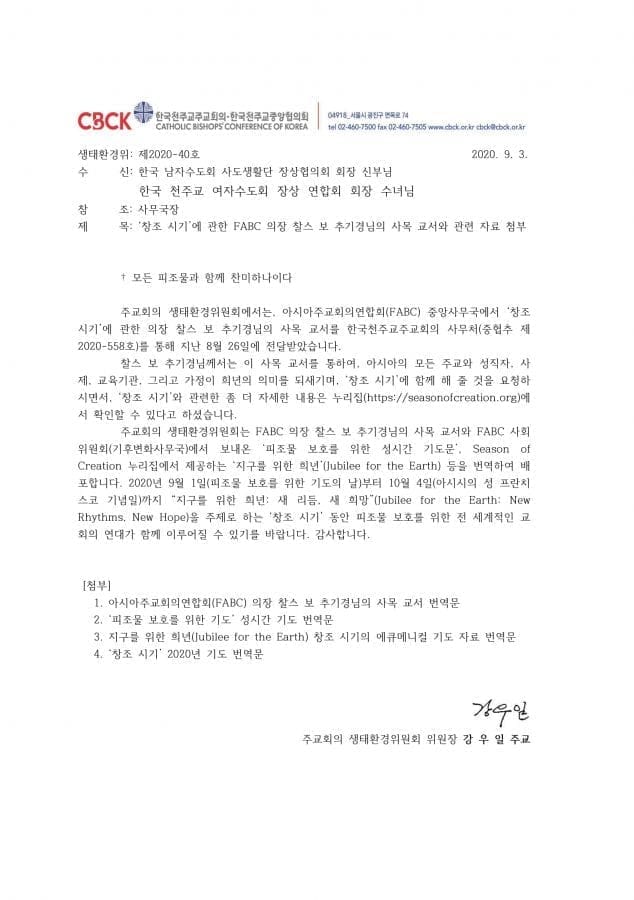 나눔 제목'창조시기'에 관한 FABC 의장 찰스 보 추기경님의 사목 교서와 관련자료 2020-09-07 11:28작성자비서실첨부파일첨부1. FABC 의장 찰스 보 추기경의 사목 교서.hwp (70.5KB)첨부2. ‘피조물 보호를 위한 기도’ 성시간과 성체 조배.hwp (94KB)첨부3. 지구를 위한 희년_2020 창조시기 경축 안내서.hwp (388KB)첨부4. 창조 시기 2020년 기도문.hwp (61KB) 목록답변 댓글 [0] 댓글작성자(*)비밀번호(*)자동등록방지(자동등록방지 숫자를 입력해 주세요)내용(*) 댓글 등록 더보기이전빈센트의 생애와 영성_짧은 영상 12편관리자2020-09-19다음조현철신부 강의_코로나 이후 어떻게 할 것인가_기후 위기와 세계화 경제관리자2020-08-06 Powered by MangBoard | 워드프레스 쇼핑몰 망보드