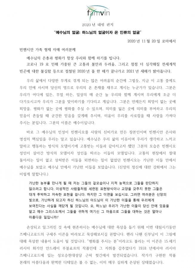 나눔 제목예수님의 얼굴: 하느님의 얼굴이자 온 인류의 얼굴_전교회 총장의 대림편지2020-11-28 14:07작성자관리자첨부파일예수님의 얼굴_2020년 마브릭 신부님 대림 편지_낭독용.pdf (1008.8KB)2020년 마브릭 신부님 대림 편지_낭독용.docx (546.4KB) 목록답변 댓글 [0] 댓글작성자(*)비밀번호(*)자동등록방지(자동등록방지 숫자를 입력해 주세요)내용(*) 댓글 등록 더보기이전대림 3주 전례 묵상글관리자2020-12-13다음함께 기도하기, 함께 생각을 모으기, 함께 행동하기_전교회 총장의 빈센트 축일 편지관리자2020-09-21 Powered by MangBoard | 워드프레스 쇼핑몰 망보드