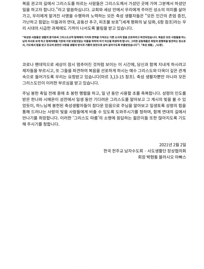 나눔 제목2021년 축성생활의 날 담화2021-02-01 09:45작성자관리자 목록답변 댓글 [0] 댓글작성자(*)비밀번호(*)자동등록방지(자동등록방지 숫자를 입력해 주세요)내용(*) 댓글 등록 더보기이전주님봉헌축일 교황님 강론관리자2021-02-06다음회개와 근원적 변화_조현철 신부 강론관리자2021-01-25 Powered by MangBoard | 워드프레스 쇼핑몰 망보드