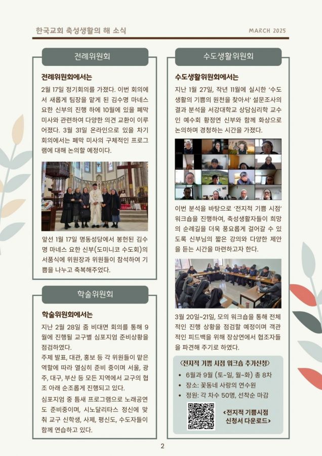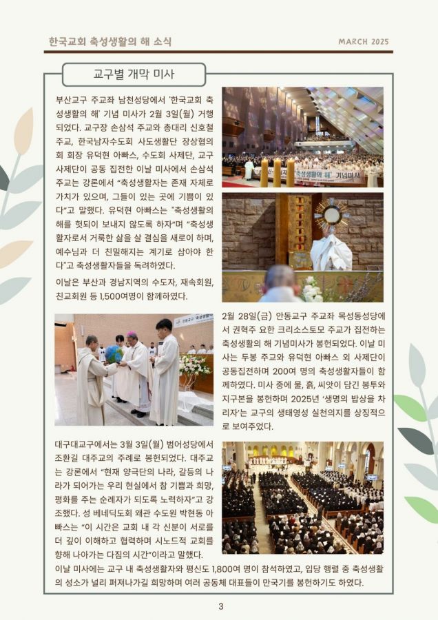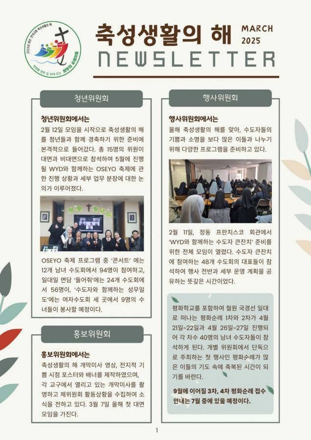 나눔 제목축성생활의 해 뉴스레터_3월호2025-03-06 16:52작성자관리자한국교회에서 지내고 있는 축성생활의 해를 풍성히 보내기 위해 구성된 여섯 개 준비위원회(전례, 수도생활, 학술, 행사, 청년, 홍보)의 활동상황과 교회 내 관련소식을 전하고 있는 뉴스레터 3월호입니다. 목록답변 댓글 [0] 댓글작성자(*)비밀번호(*)자동등록방지(자동등록방지 숫자를 입력해 주세요)내용(*) 댓글 등록 더보기이전재수탱이 시몬_협력자회 10주년 기념 초대 연극관리자2025-03-22다음빈첸시안가족 사순시기 담화문관리자2025-03-06 Powered by MangBoard | 망보드 스토어